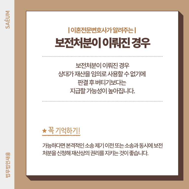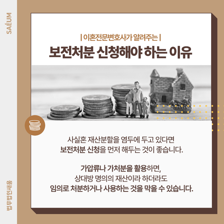물론 명의를 이전하거나 처분했다 하더라도 재산분할이 아예 불가능해지는 것은 아니지만, 이를 복구해 다시 청구하는 과정에서 많은 시간과 비용이 소요될 수 있습니다. 따라서 이러한 문제를 사전에 예방하기 위해 분할 대상 재산에 대한 보전처분을 미리 해두는 것이 바람직합니다. 가압류나 가처분을 통해 청구권을 확보하고, 재산을 보전할 수 있어야 합니다.