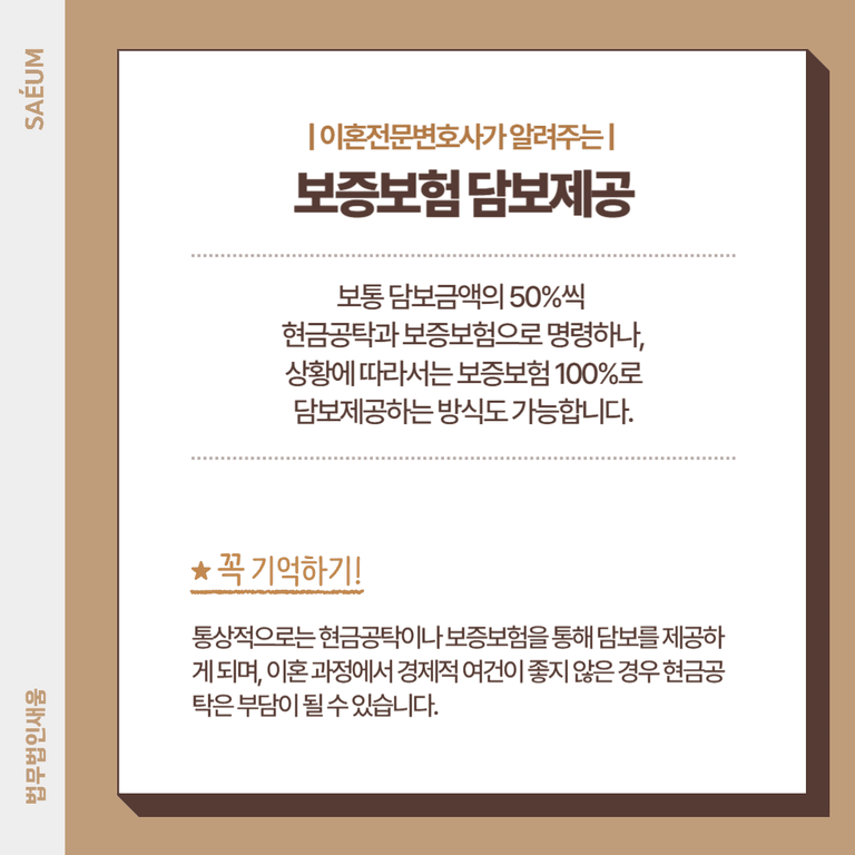 보전처분을 신청해 상대방의 재산을 묶는 경우, 이에 따른 담보제공명령이 함께 내려집니다. 이는 상대방이 예상치 못한 손해를 입는 상황에 대비하기 위한 장치입니다. 통상적으로는 현금공탁이나 보증보험을 통해 담보를 제공하게 되며, 이혼 과정에서 경제적 여건이 좋지 않은 경우 현금공탁은 부담이 될 수 있습니다.