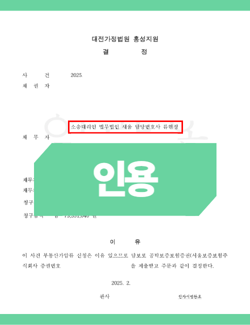결국 위자료 청구금액 중 일부인 3천만 원과 재산분할 청구금액 중 일부인 43,351,040원을 합산한 총 73,351,040원에 대한 추가 가압류 신청이 인용되었습니다. 신청서에는 상대방이 위자료를 지급해야 할 경위와 보전처분의 필요성 등을 상세히 기술하였고, 그 결과 현금공탁 없이 전액에 대해 지급보증위탁계약으로 담보제공명령을 받을 수 있었습니다. 신청일로부터 5일 만에 전부 인용결정을 받아, A씨는 안정적으로 채권을 확보할 수 있었습니다.