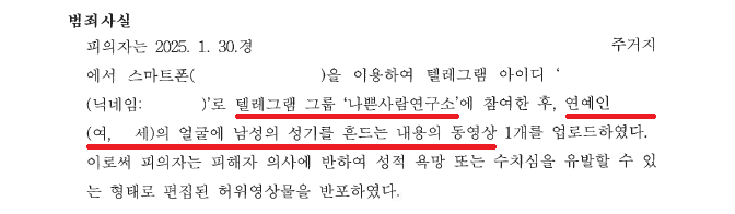 A씨는 2025. 1. 30.경 연예인 합사방 텔레그램 그룹 '나쁜사람연구소'에 참여하여 여성 연예인 B씨의 얼굴에 남성의 성기를 흔드는 내용의 동영상 딥페이크를 업로드하였습니다.