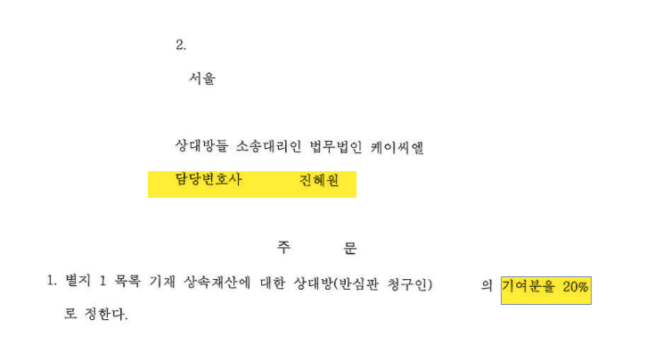 오늘 소개해드릴 상속재산분할심판 사건에서는 상속인인 의뢰인의 기여분이 20%로 인정되었습니다.