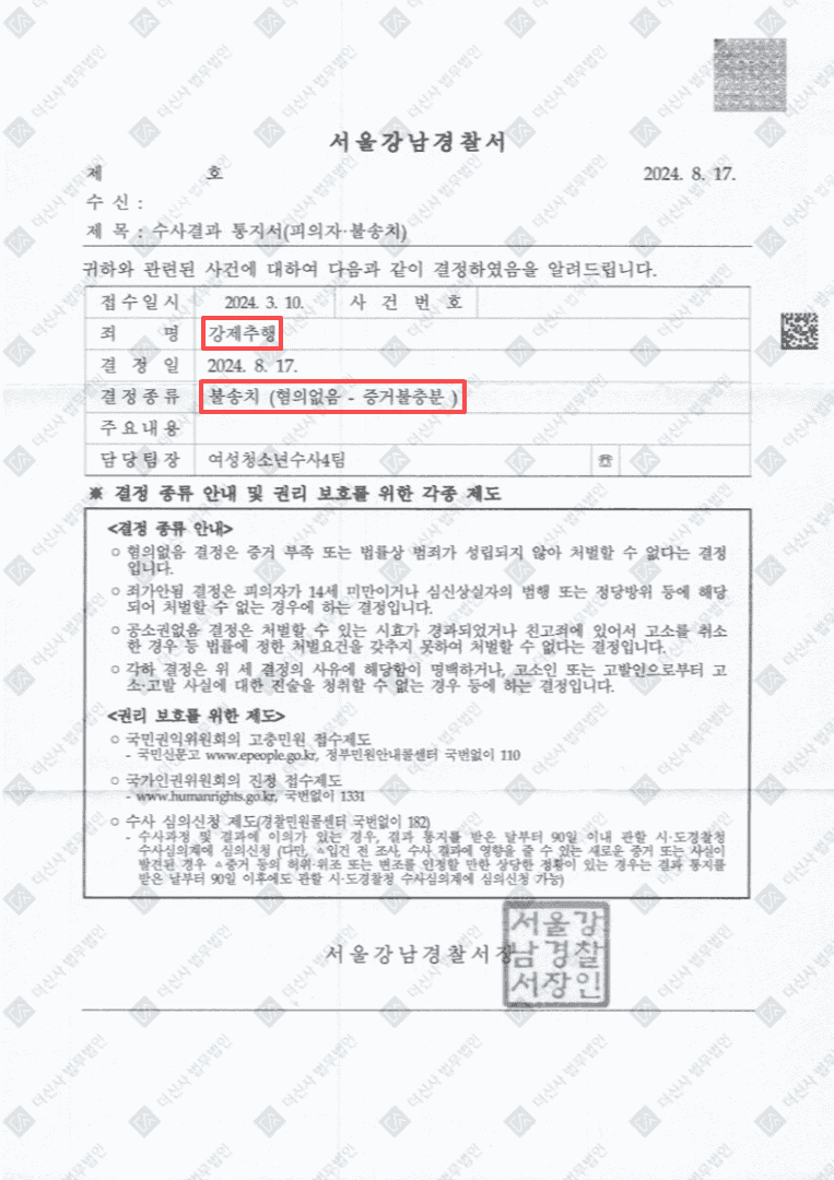 🆗저희는 의뢰인과의 상담 및 더신사의 성범죄 솔루션을 통해 클럽 내 CCTV 및 목격자 진술을 통해 의뢰인이 의도적으로 신체 접촉을 하지 않았음을 입증했고, 상대방이 오히려 의뢰인에게 접근해 먼저 접촉했음을 확인했습니다. 이 증거를 바탕으로 경찰은 의뢰인에게 무혐의 결정을 내렸습니다.