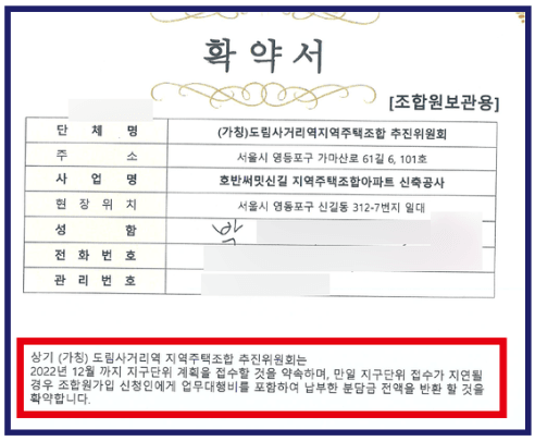 해당 문서에 기재된 ‘전액 환불’ 약정은 조합이 보유한 분담금, 즉 단체의 공동재산을 활용해 반환하겠다는 내용을 담고 있는 만큼, 이는 조합 총유물에 대한 처분에 해당합니다. 이러한 약정은 반드시 총회의 의결을 거쳐 조합원 전체의 동의 아래 성립되어야 하나, 도림사거리역 지역주택조합은 이러한 필수 절차를 거치지 않고 해당 확약서를 발급하였습니다. 이에 따라 이와 같은 약정은 법적으로 효력이 없다는 점이 여러 법원의 판결을 통해 확인된 바 있습니다.