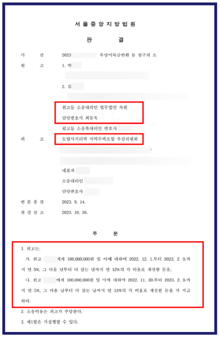 그 결과, 서울중앙지방법원은 최동욱 변호사의 이러한 주장을 받아들여 도림사거리 지역주택조합이 의뢰인에게 납부한 분담금 총 2억 원을 반환하라는 판결을 내림으로써 전액 반환을 인정하였습니다.