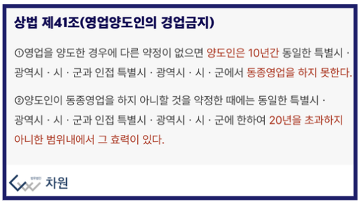 경업금지의무란, 영업 양도 계약을 체결할 때 양도인(매도인)이 일정 기간 동안 동일하거나 경쟁 관계에 있는 업종에서 다시 영업을 하지 않겠다고 약속하는 의무를 의미합니다. 이는 상당한 금액의 권리금을 지급하고 영업을 인수한 양수인의 사업을 보호하기 위한 제도로, 만약 양도인이 이 약속을 어길 경우, 양수인은 상법 제41조를 근거로 손해배상을 청구할 수 있습니다.