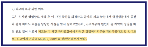 또한, 피고는 G 교사가 단순히 고용된 직원이 아니라 동업자이기 때문에 경업금지 조항 위반이 아니라는 주장도 펼쳤으나, 법원은 계약 형태와 무관하게 G의 활동이 기존 학원의 영업에 직접적인 영향을 주는 행위에 해당하므로, 이 또한 특약사항 위반에 해당한다고 보았습니다.