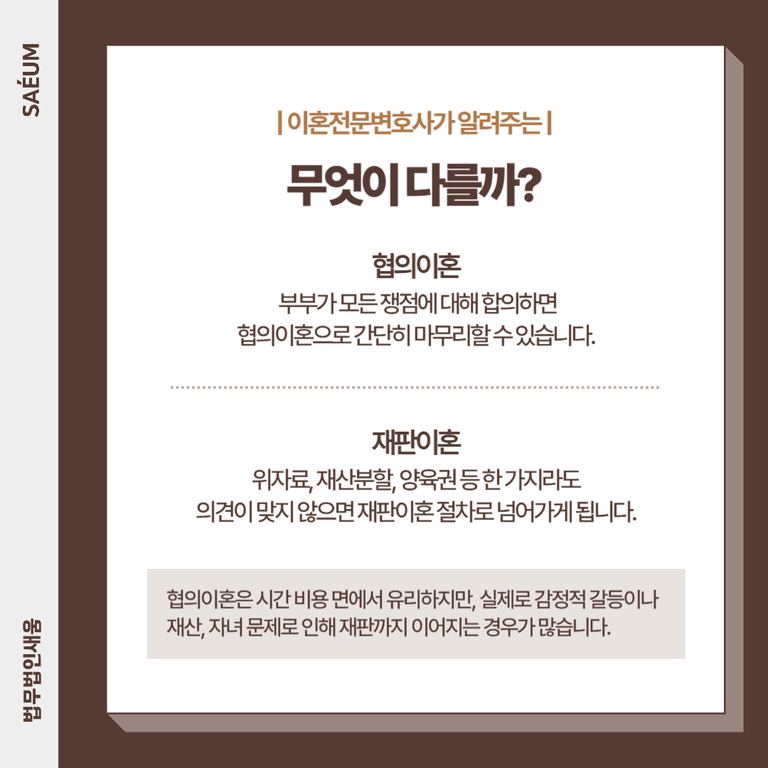 이혼은 결혼만큼이나 인생의 중요한 전환점입니다. 단순한 감정적 결별이 아니라, 법적 절차와 경제적 이해관계, 그리고 자녀의 미래까지 복합적으로 얽혀 있기 때문입니다. 이혼을 고민한다면, 처음부터 협의이혼과 재판이혼 중 어떤 방식이 내 상황에 맞는지 신중하게 판단하고, 각 절차에 맞는 전략을 세우는 것이 필수입니다.