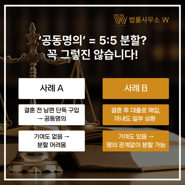이혼을 앞두고 가장 많이 오해하는 것 중 하나는 “공동명의로 된 부동산은 반반 나눠야 한다”는 인식입니다.