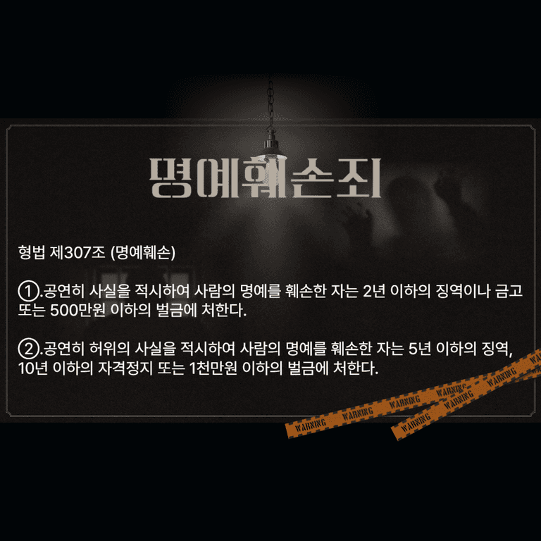 형법 제307조 제1항은 "공연히 사실을 적시하여 사람의 명예를 훼손한 자는 2년 이하의 징역이나 금고 또는 500만원 이하의 벌금에 처한다"고 규정하고 있습니다. (형법 제307조 제1항)