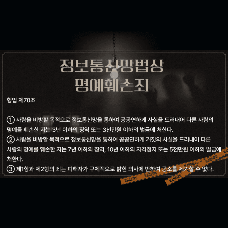 정보통신망법 제70조 제1항은 "사람을 비방할 목적으로 정보통신망을 통하여 공공연하게 사실을 드러내어 다른 사람의 명예를 훼손한 자는 3년 이하의 징역 또는 3천만원 이하의 벌금에 처한다"고 규정하고 있습니다. (정보통신망 이용촉진 및 정보보호 등에 관한 법률 제70조 제1항)
