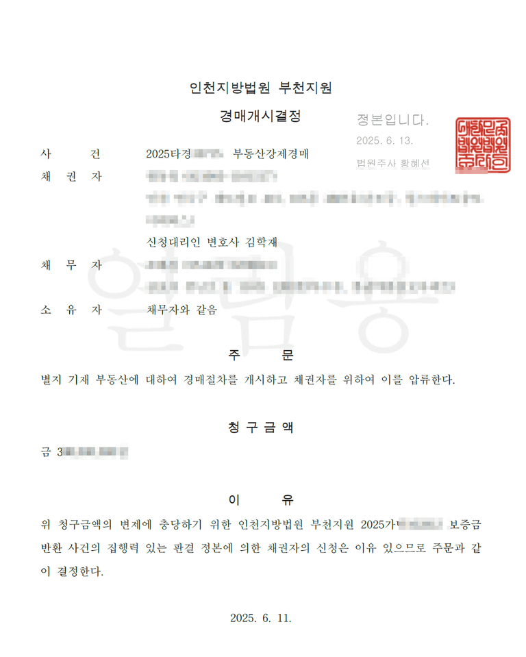 [승소] 2025년 6월 11일 경매개시결정