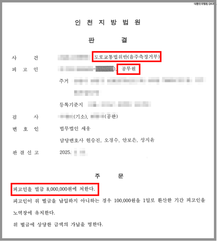 법원에서는 의뢰인이 몸을 가누지 못할 정도의 만취 상태였던 점 등 불리한 정상을 지적하면서도 변호인의 변론을 고려하여 의뢰인에게 벌금형의 선처를 하여주었고, 의뢰인은 당연퇴직을 면할 수 있었습니다.