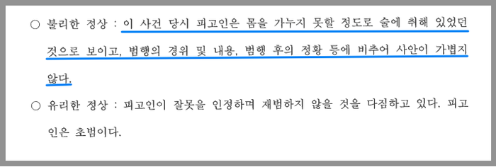변호인은 의뢰인이 진심으로 뉘우치고 잘못을 되풀이 하지 않기 위해서 각고의 노력을 다하고 있음을 보여주는 한편, 재판부에서 의뢰인의 죄질을 좋지 않게 보는 것을 최대한 방지하고자 의뢰인이 처한 형편과 사건 당시의 상황에 대해서 충분한 설명하였습니다.