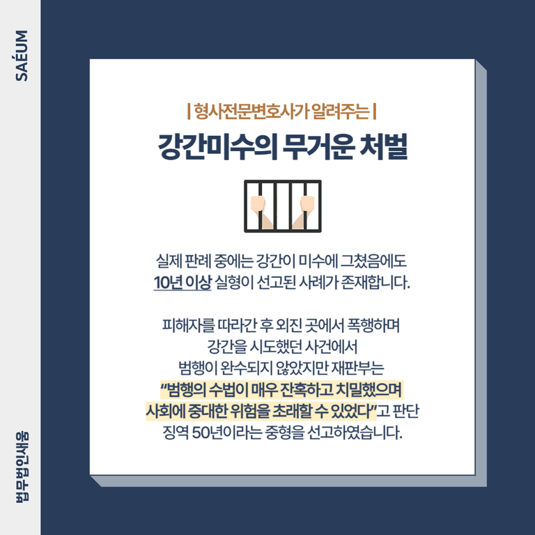 실제 판례 중에는 강간이 미수에 그쳤음에도 10년 이상 실형이 선고된 사례가 존재합니다.