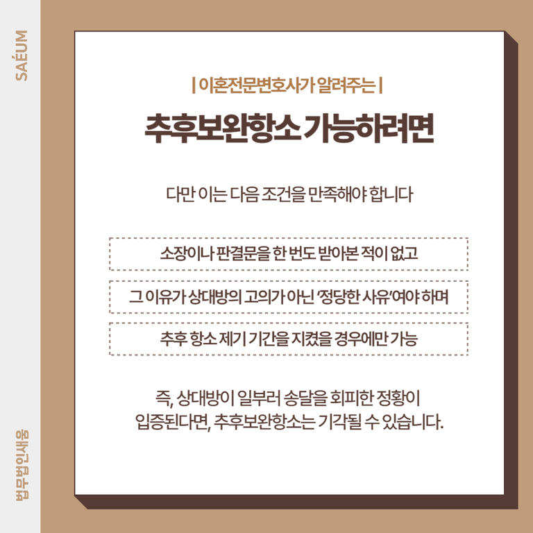 즉, 상대방이 일부러 송달을 회피한 정황이 입증된다면, 추후보완항소는 기각될 수 있습니다.