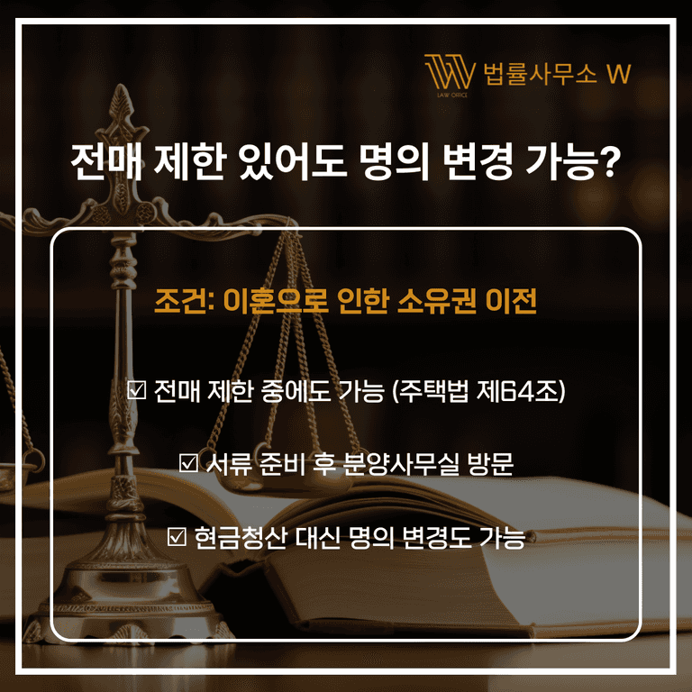 특히 전매제한이 있는 분양권의 경우, 일반적으로는 명의 변경이 불가능하지만, 주택법 제64조 및 시행령 제73조에 따라 ‘이혼’ 사유라면 예외적으로 변경이 허용됩니다.