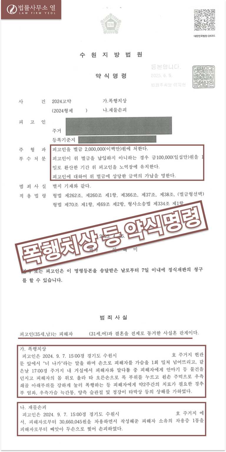 검사는 가해자에 대하여 폭행치상죄 및 재물손괴죄로 약식기소하였고, 수원지방법원은 가해자에 대하여 벌금 200만 원의 약식명령을 발부하여 확정됨으로써 피해자의 억울함을 조금이나마 덜어주었습니다. 이후 피해자는 본 법률사무소를 통하여 가해자에 대한 민사상 손해배상 소송을 진행하고 있습니다. 이 소송에는 폭행 등 범죄에 대한 손해배상 뿐 아니라, 파혼에 대한 위자료 청구까지 포함되어, 열은 피해자의 억울함을 덜어드리기 위해 최선을 다하고 있습니다.