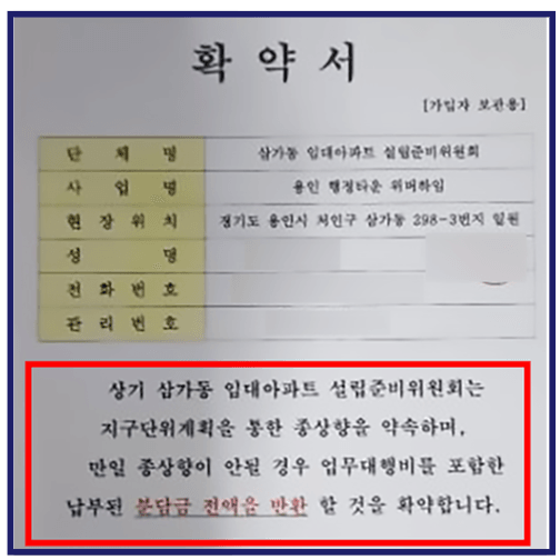 당시 위 단체는 계약과정에서 "2023년 8월 26일까지 지구단위계획을 접수하겠다"고 명시하며, 만일 계획 접수가 지연될 경우 계약자의 요청에 따라 회원(발기인) 가입을 해지하고, 업무대행비를 포함한 납입금 전액을 반환하겠다는 취지의 확약서를 함께 교부하였습니다.
