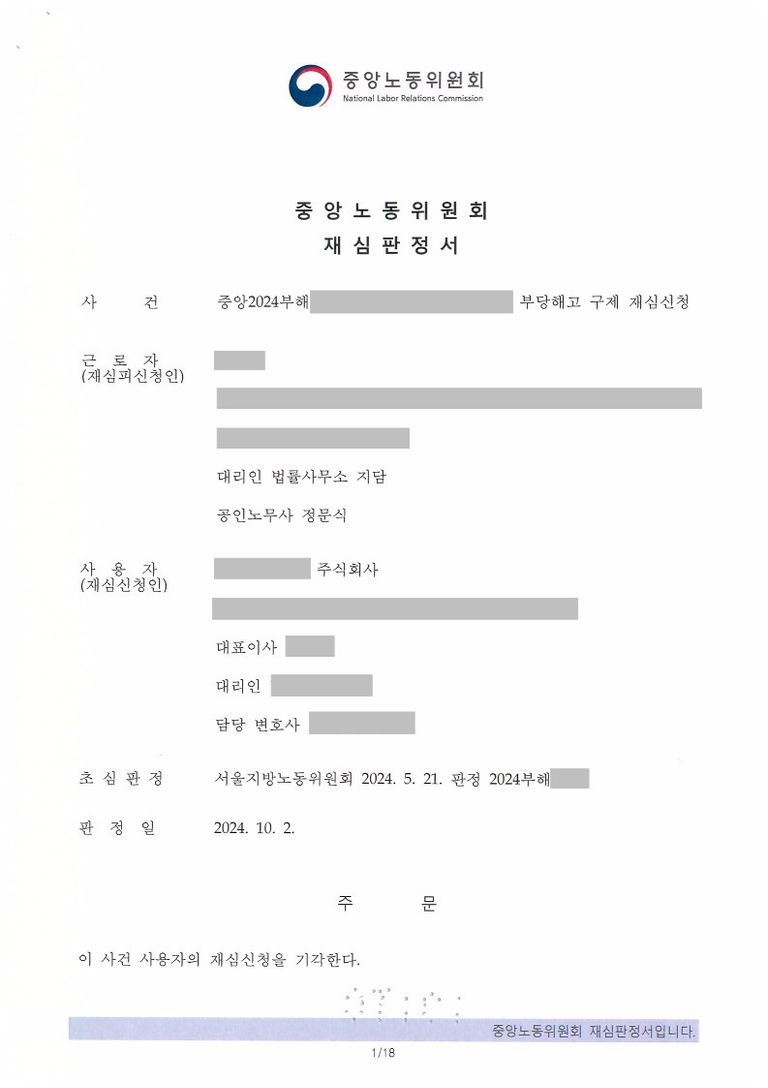 노동위원회는 초심과 재심 모두 노동자의 손을 들어주었습니다.