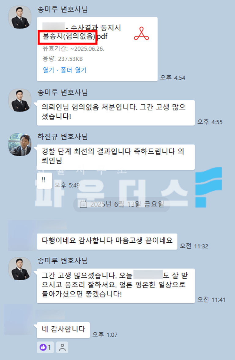 이에 변호인은 담당 수사관과의 면담 및 변호인 의견서 작성을 통해 증거자료를 기반으로 한 논리적인 내용으로 변호하며 사건이 마무리되는 순간까지 성실한 조력을 드렸습니다.