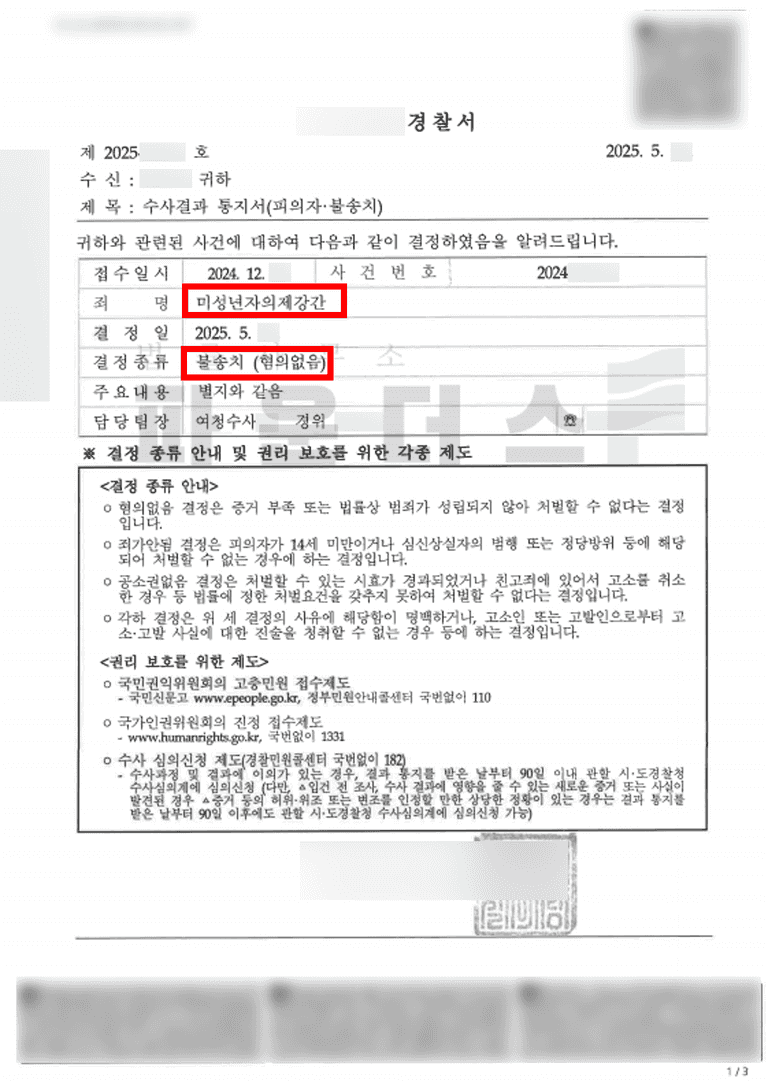 그 결과 의뢰인은 15세 미성년자와 3회 성관계에 이른 미성년자의제강간 사건에 있어 불송치 결정(혐의없음)으로 경찰단계에서 조속히 마무리 지을 수 있었습니다.