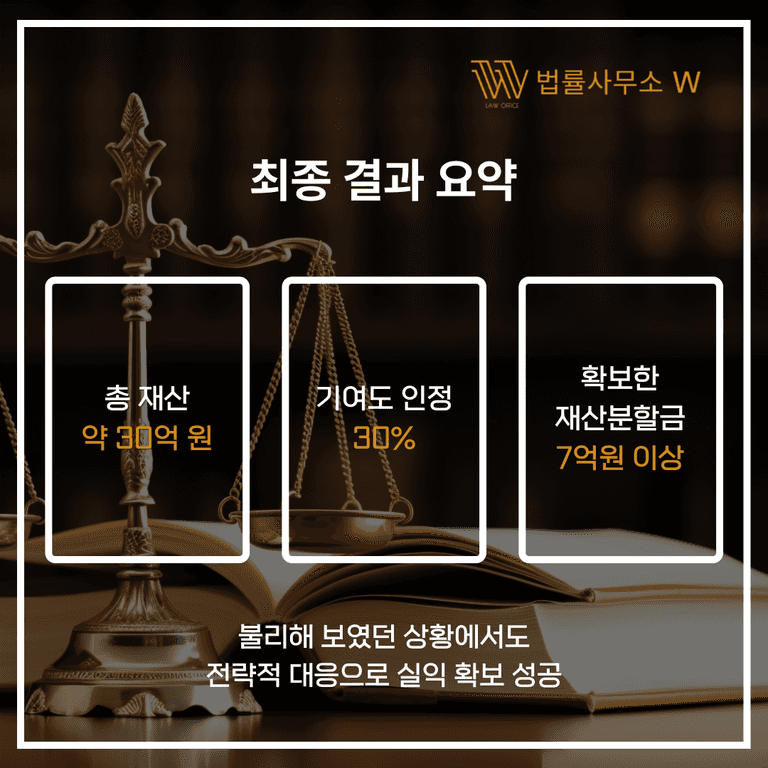 최종적으로 의뢰인은 7억 원 이상의 재산분할금을 확보하게 되었습니다.