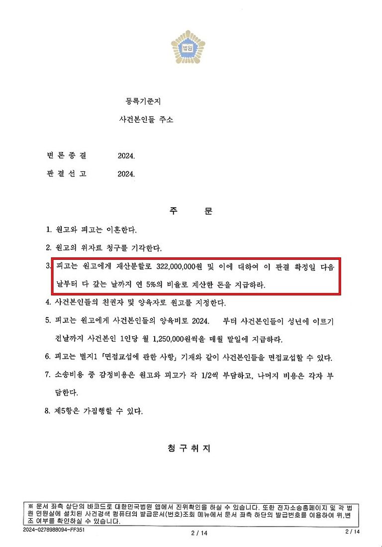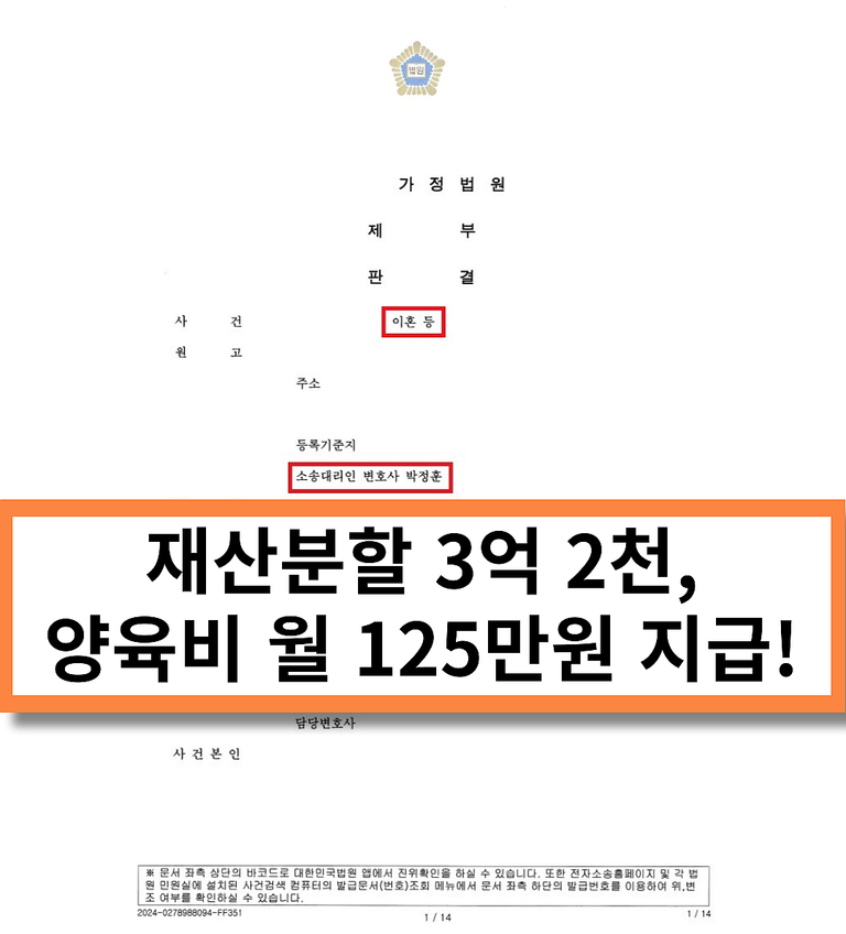 재산분할 3억 2천, 양육비 월 125만 원 지급받으며