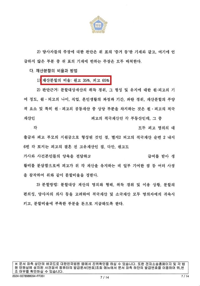 여러 사정을 참작하여 기여도 35%로 약 3억 2천 상당의 재산을 분할 받고,