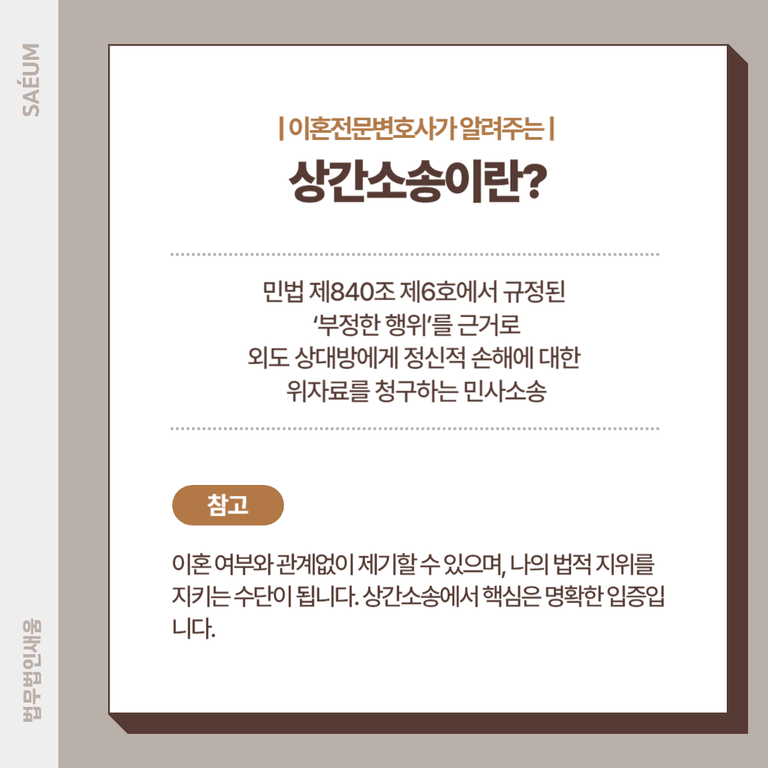 상간소송은 민법 제840조 제6호에서 규정된 ‘부정한 행위’를 근거로, 배우자 외도 상대방에게 정신적 손해에 대한 위자료를 청구하는 민사소송입니다. 이혼 여부와 관계없이 제기할 수 있으며, 나의 법적 지위를 지키는 수단이 됩니다.