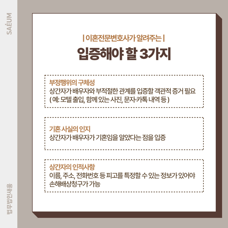 상간소송에서 핵심은 명확한 입증입니다. 즉, 다음 세 가지를 증명해야 합니다: