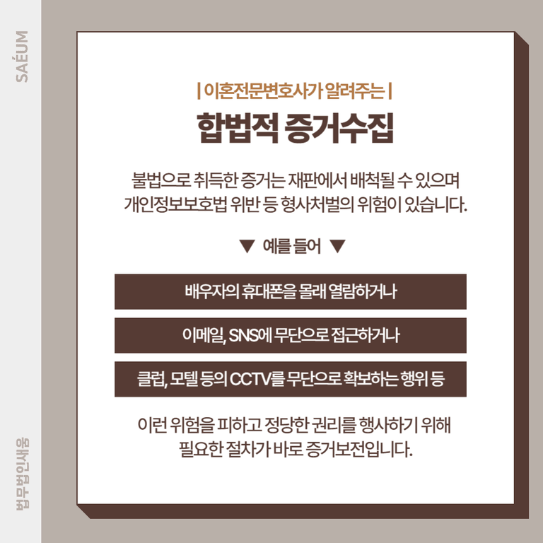상간소송은 감정이 앞서는 사건입니다. 하지만 그럴수록 더 냉정하게 접근해야 합니다. 불법으로 취득한 증거는 재판에서 배척될 수 있으며, 나아가 개인정보보호법 위반 등 형사처벌의 위험이 있습니다.