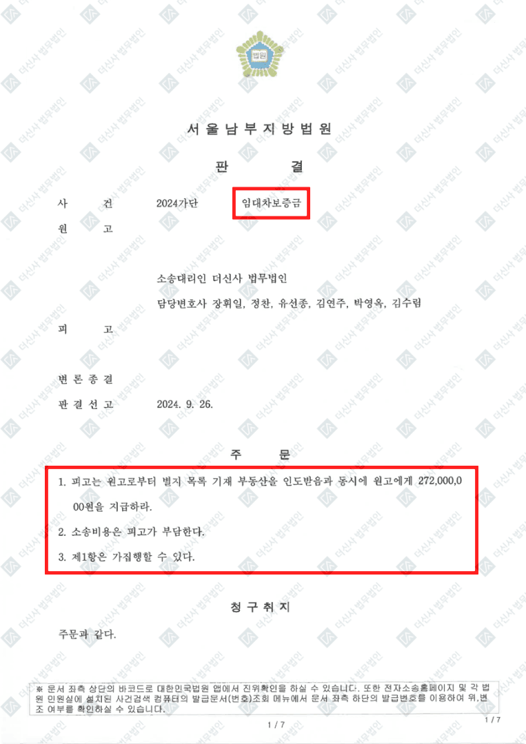 사건 결과: 보증금 반환 인용