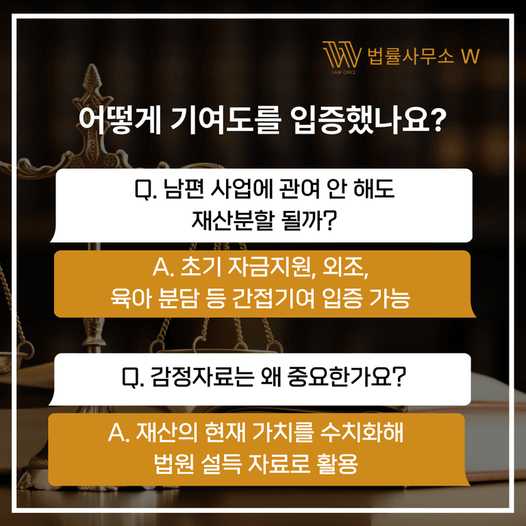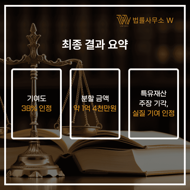 하지만 이 사건에서 저희는 기여도 38%를 인정받아 약 1억 4천만 원의 재산분할을 성공적으로 이끌어냈습니다.