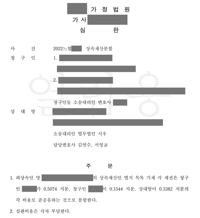 의뢰인의 입장을 꼼꼼히 법리적으로 설득해 실질적인 상속분을 확보한 김연수 변호사의 성공 사례입니다.
