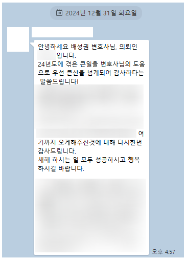 의뢰인께서는 자신을 끝까지 믿어준 저에게 아래와 같은 카카오톡 메시지를 보내주셨습니다.
