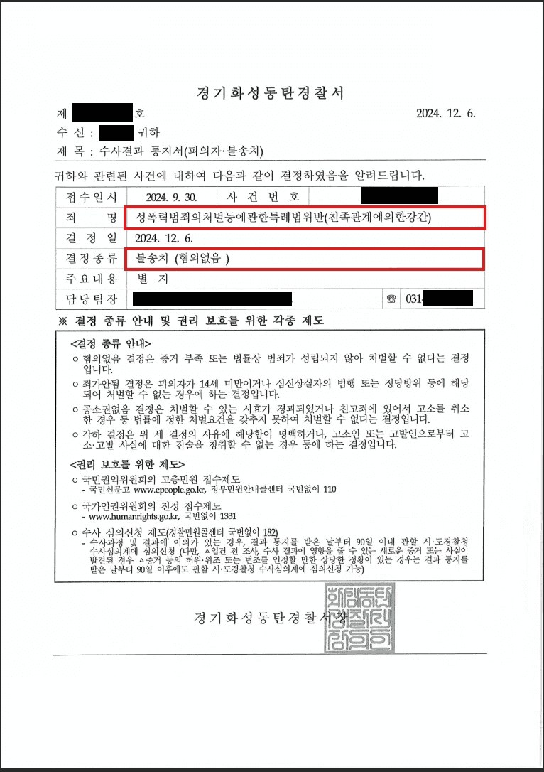 그 결과 수사기관으로부터 성폭력범죄의처벌등에관한특례법위반(친족관계에의한강간) 혐의에 대하여 불송치(혐의없음)결정을 받을 수 있었습니다.