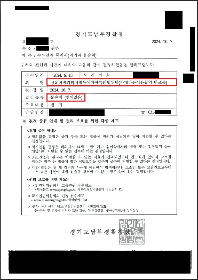 이상과 같은 절차를 거쳐 담당 수사관님께서는 의뢰인에게 카메라등이용촬영반포의 고의가 없다고 보아 불송치(혐의없음) 결정을 내려주셨습니다.