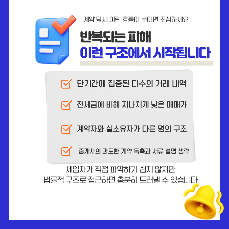 실소유자와의 괴리, 과도한 계약 독촉, 매매가에 비해 높은 보증금 등 사기의 전형적 흐름이 반복되었습니다.