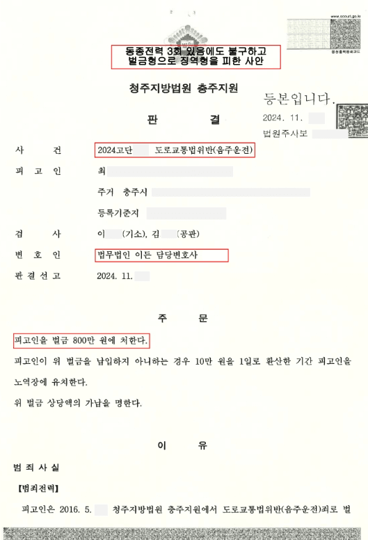 위와 같은 점을 강력하게 주장하여, 의뢰인은 실형은 면하고 벌금 800만원을 받게 되었습니다.