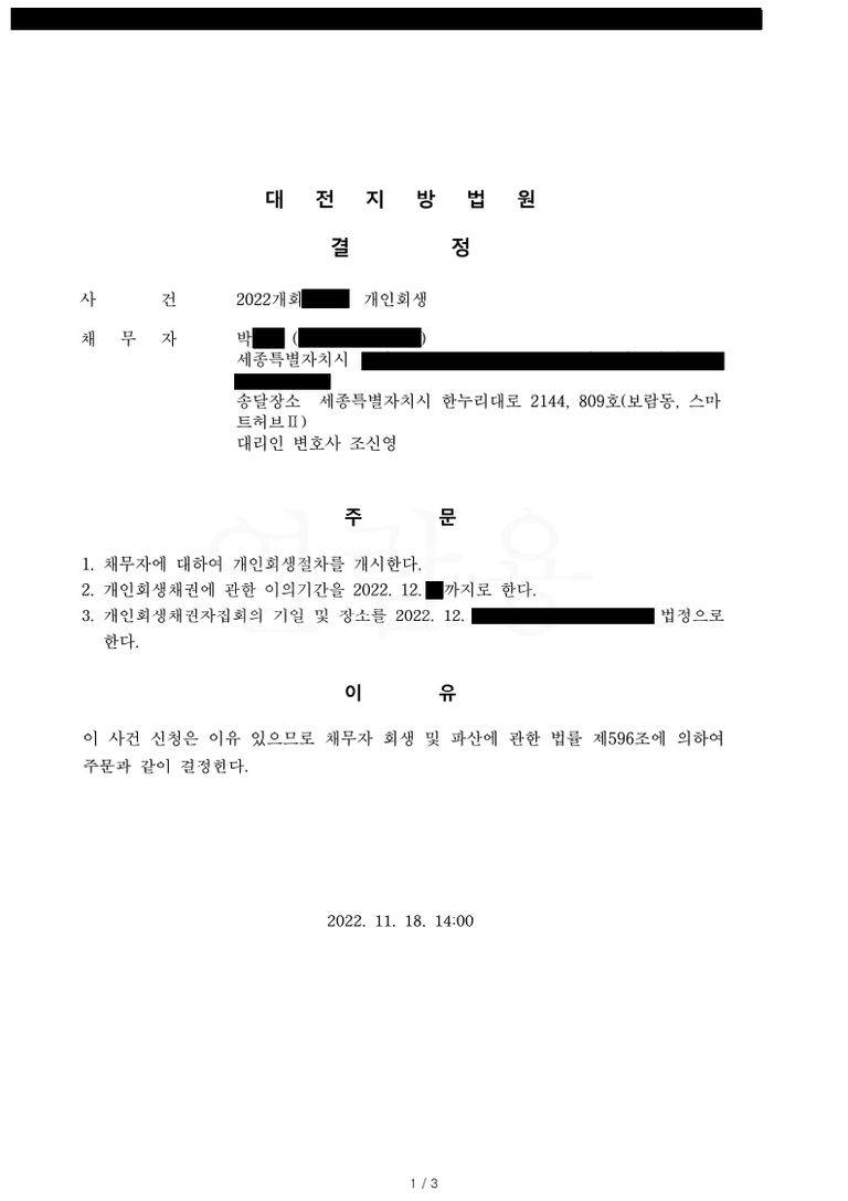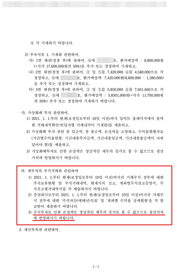 이에 관한 의견서, 소명자료 등을 상세히 기재하여 보정서를 제출하였고, 그 결과 주식투자손실금은 청산가치에서 제외한 채, 변제계획이 인가되어 변제금을 대폭 낮출 수 있었습니다.