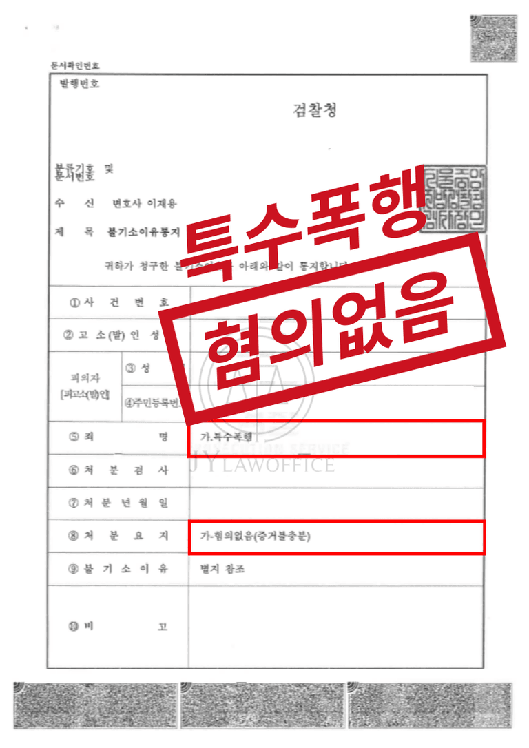 이와 같은 본 형사 전문 변호사의 조력으로, 의뢰인은 특수폭행 혐의에서 혐의 없음의 처분을 받아 무사히 사건을 마무리할 수 있었습니다.