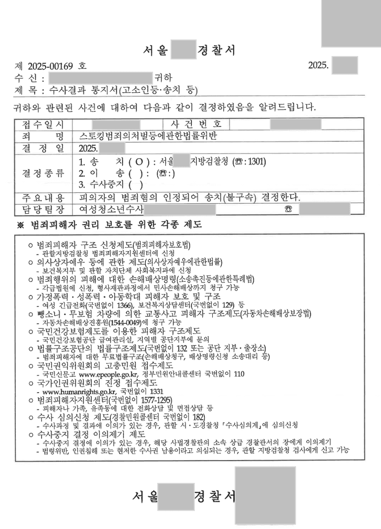 3) 피해자의 연락 거부 여부에 따라 스토킹 처벌 여부가 달라진다면 가해자의 처벌 여부가 피해자의 사소한 행동 하나에 좌우된다는 것으로서 피해자에게 책임을 전가하게 된다는 점을 강조하는 의견서를 작성, 제출하였습니다.