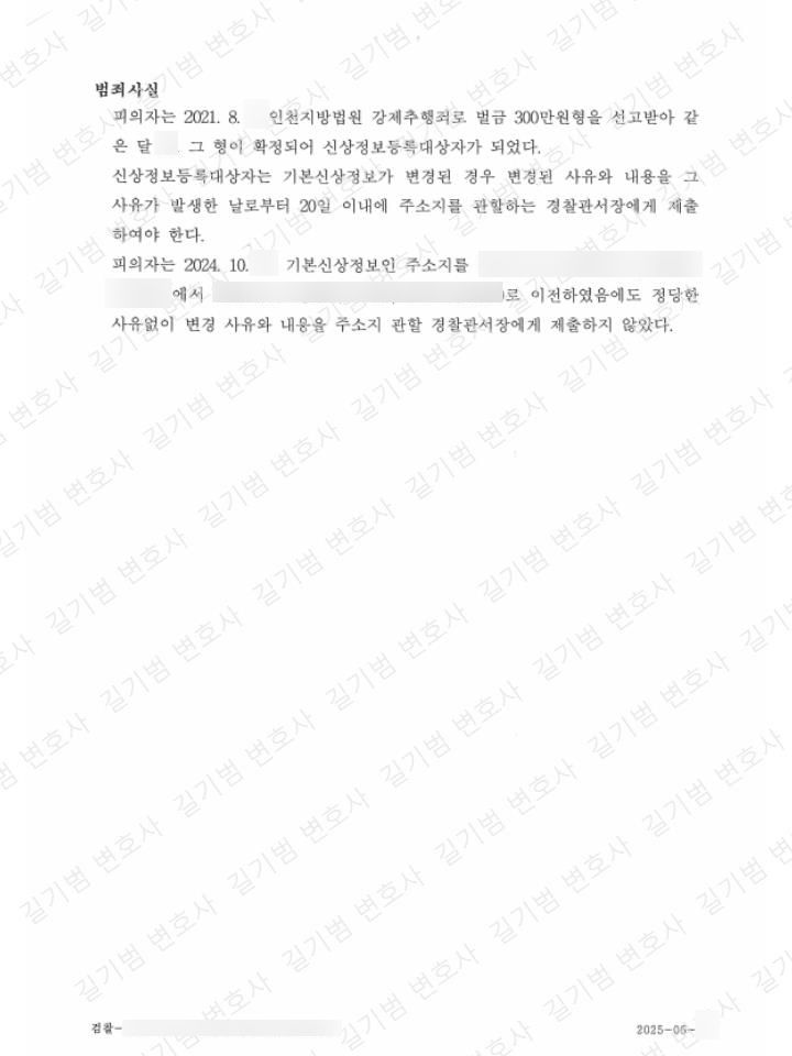 제가 최근에 수행한 사례에서 의뢰인은 회사의 기숙사 문제로 주소지가 변경되었는데, 변경된 주소지를 경찰서에 20일 이내에 제출하지 않아 신성정보등록 위반 혐의로 조사를 받게 되었습니다.