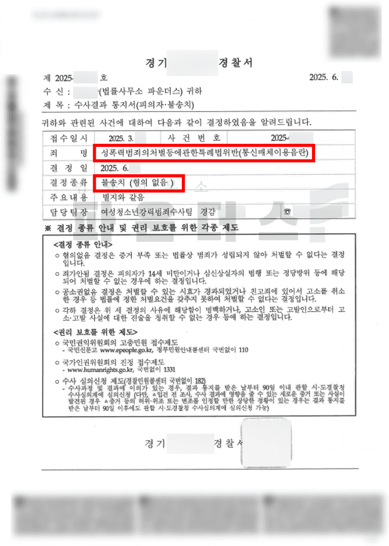 그 결과 의뢰인은 카톡 오픈채팅방에 신체사진을 전송한 통매음 사건에 있어 불송치 결정(혐의없음)으로 경찰단계에서 마무리 지을 수 있었습니다.