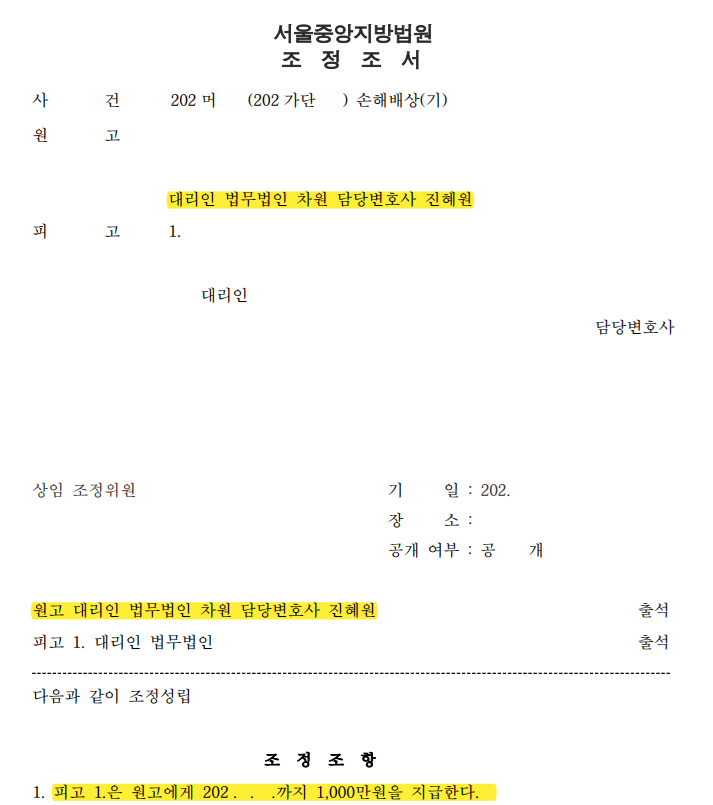 사건은 몇 차례의 변론기일을 거쳐 조정재판부에 회부되었고, 조정기일에서 피고는 1,000만 원을 배상하겠다는 의사를 밝혔습니다.