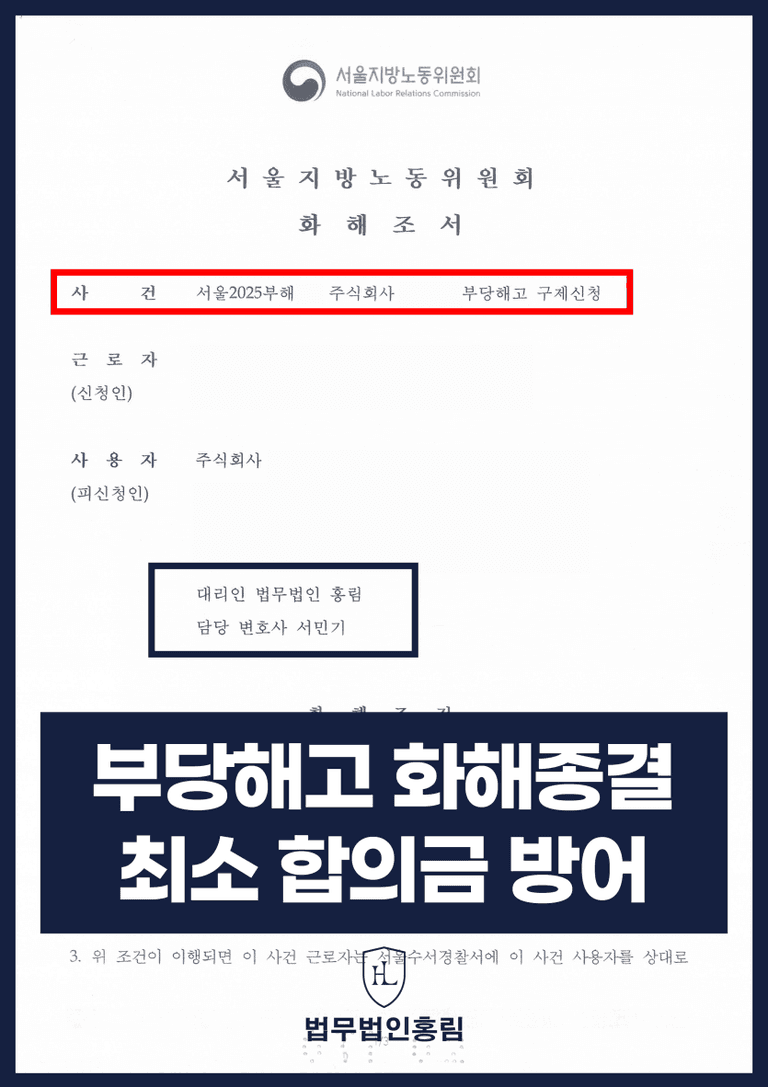 노동전문로펌 홍림의 조력 결과, 상대방(퇴사한 수습근로자)이 주장하는 3개월치 임금 및 기타 부대 비용이 아닌, 저희 의뢰인이 수용 가능한 선에서 합의금을 통해 지방노동위원회 단계에서 화해종결을 할 수 있었습니다.
