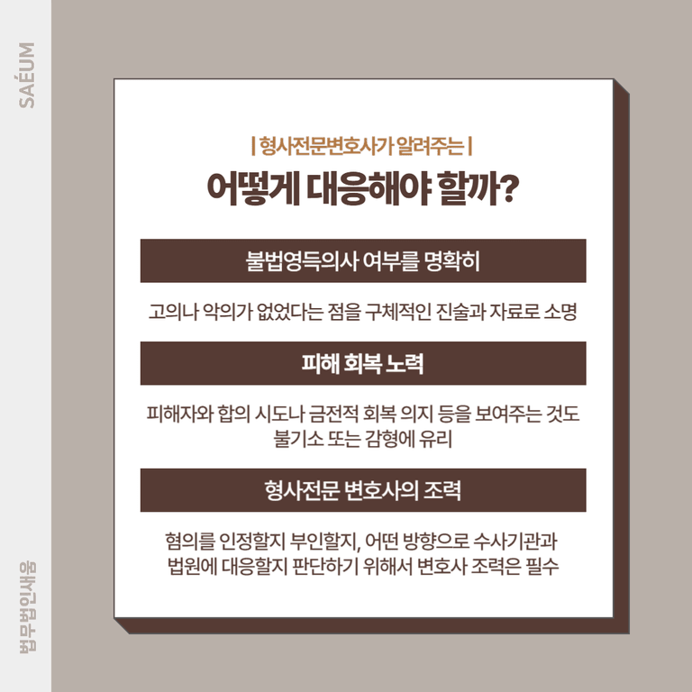 혐의를 인정할지 부인할지, 어떤 방향으로 수사기관과 법원에 대응할지 판단하기 위해서는 반드시 경험 많은 형사전문 변호사와 상의해야 합니다.