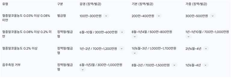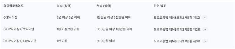 이 표는 음주운전의 형사처벌 기준을 혈중알코올농도 수치에 따라 명확하게 구분하여 제시함으로써, 각 수치별 법적 위험성을 직관적으로 이해할 수 있도록 돕습니다. 이는 법적 고찰의 핵심 정보이며, 자신의 상황을 대입하여 처벌 수위를 예측하는 데 유용합니다. 또한, 도로교통법의 구체적인 조항을 명시하여 정보의 신뢰성과 전문성을 높입니다.
