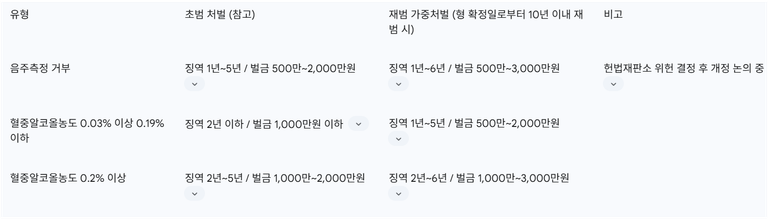 이 표는 윤창호법의 핵심인 재범 가중처벌 기준을 명확히 제시하며, 특히 헌법재판소의 위헌 결정 이후의 논의 방향을 포함하여 최신 법적 동향을 반영합니다. 초범과 재범의 처벌 수위를 비교함으로써 재범의 법적 위험성을 한눈에 파악할 수 있게 하여 이해를 돕습니다.
