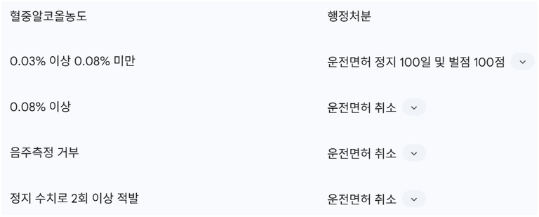 음주운전은 형사처벌 외에 운전면허에 대한 행정처분도 수반합니다. 혈중알코올농도 0.03% 이상 0.08% 미만인 경우 운전면허 정지 100일과 벌점 100점이 부과됩니다. 혈중알코올농도 0.08%를 초과하거나, 경찰의 음주측정 요구에 불응하는 경우 운전면허가 취소됩니다. 또한, 면허 정지 수치(0.03% 이상 0.08% 미만)로 2회 이상 적발될 시에도 운전면허 취소 처분을 받을 수 있습니다.